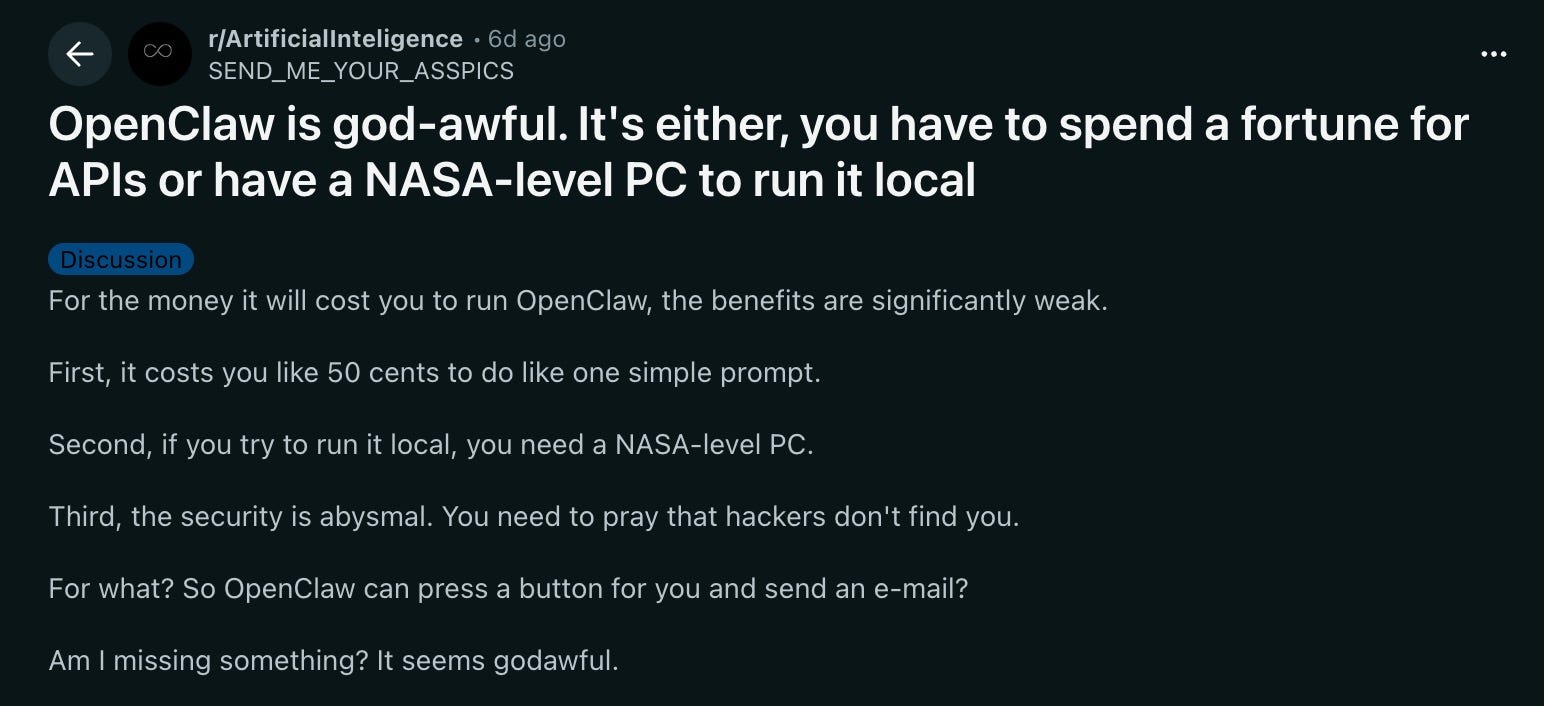 These reduce the friction of using OpenClaw, but they don’t solve the fundamental problems. The underlying costs are still astronomical. Security is still a challenge (especially if you want to connect to work apps). You’re still consuming millions of tokens for relatively mundane use cases.