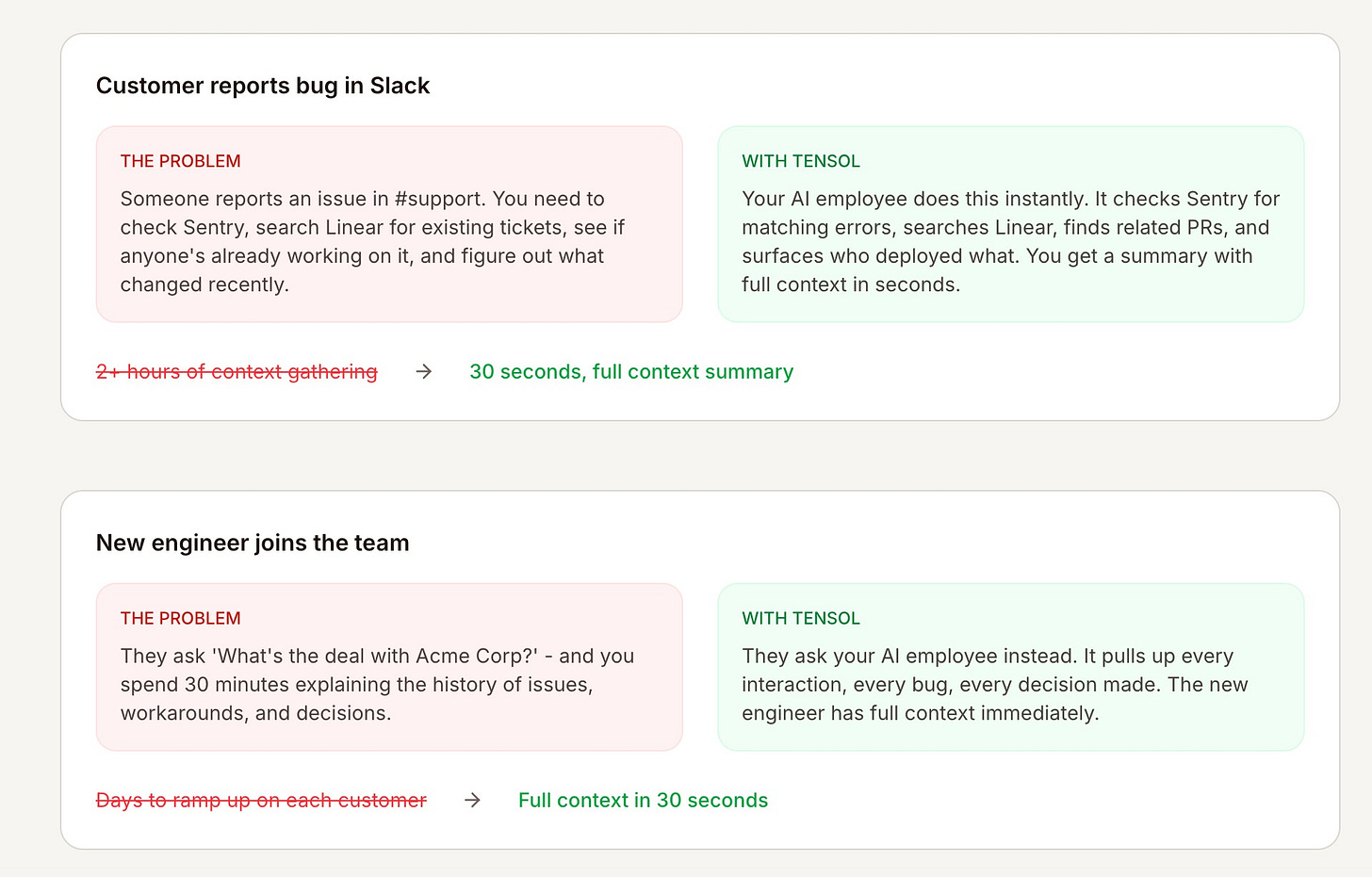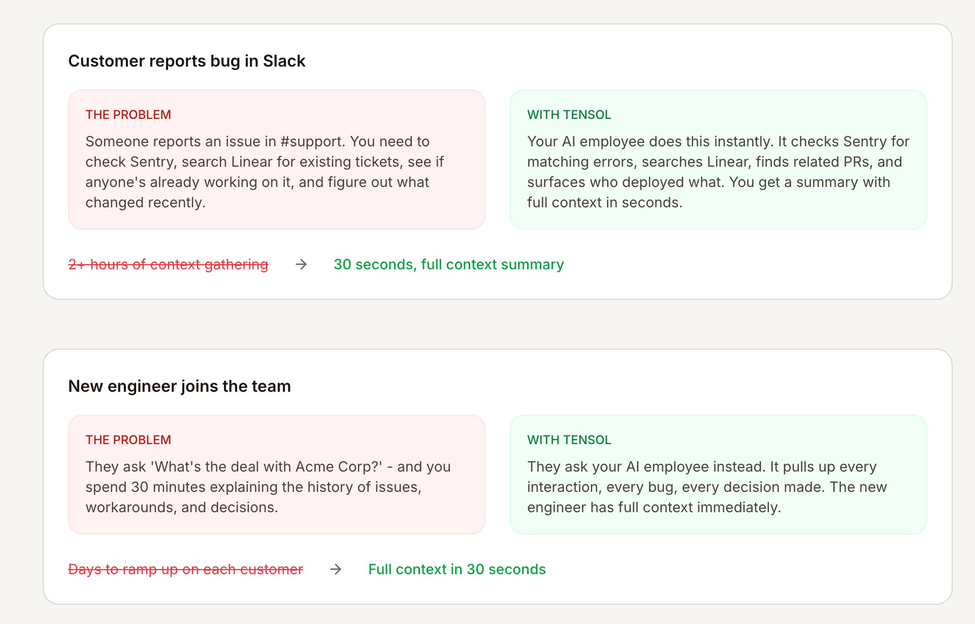A great example of this is Tensol, another company from Y Combinator’s W26 batch. They offer “AI employees” (which now sound a lot more credible than the flood of crude AI employees of a few years ago).