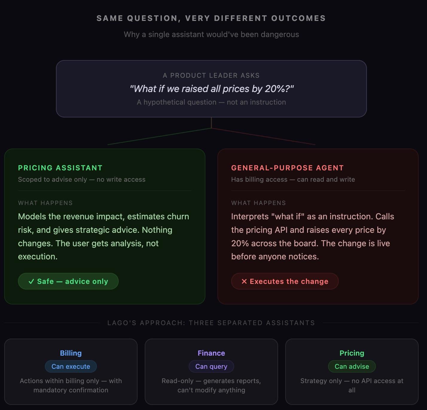 Imagine a product leader asks “what if we raised all prices by 20%?” If they’re talking to the pricing assistant, they get strategic advice. If they’re talking to a general-purpose agent with billing access, it might interpret this as an instruction to raise prices and execute the change.