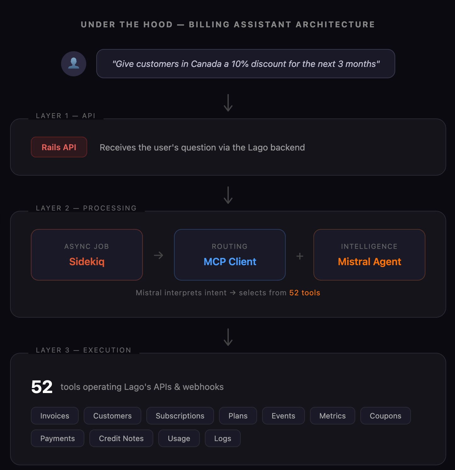 This made a big difference because building an agent that operates APIs is harder than building a chatbot, especially in billing. It requires permission systems, confirmation flows, audit logs and safeguards.