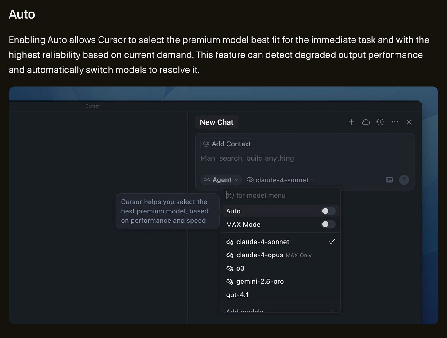 Cursor offers “auto mode”, which automatically routes each request to a model. Cursor states this lets it route to the most performant model to avoid delays. But it also has another benefit: