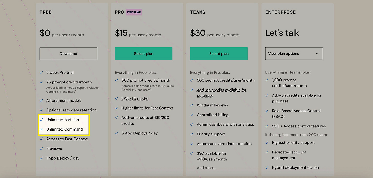 This is why Windsurf offers unlimited Fast Tab and Command: These actions predictably consume few tokens, so it’s possible to offer unlimited.