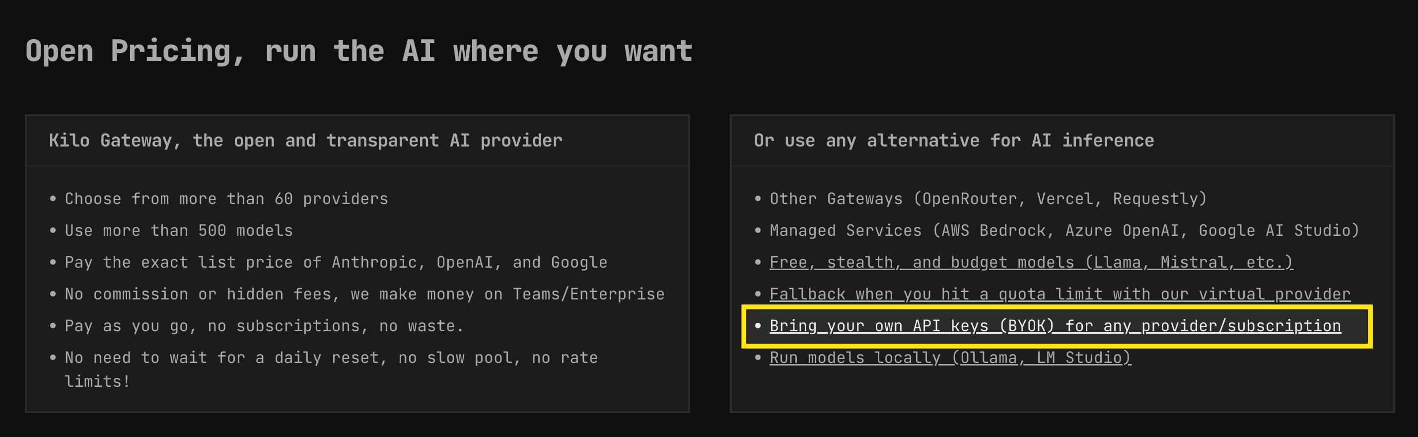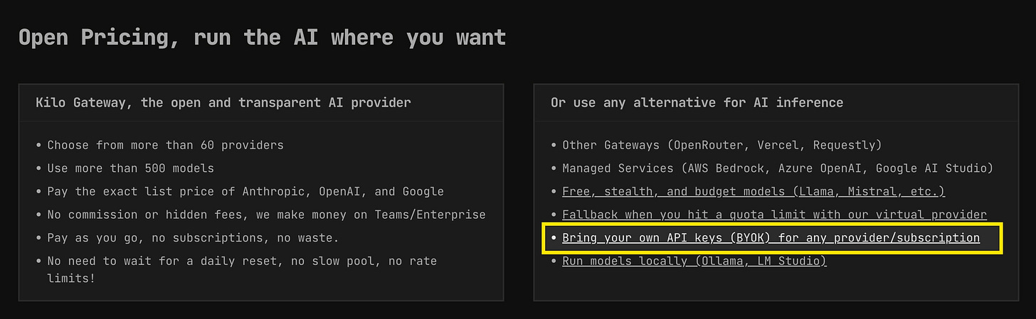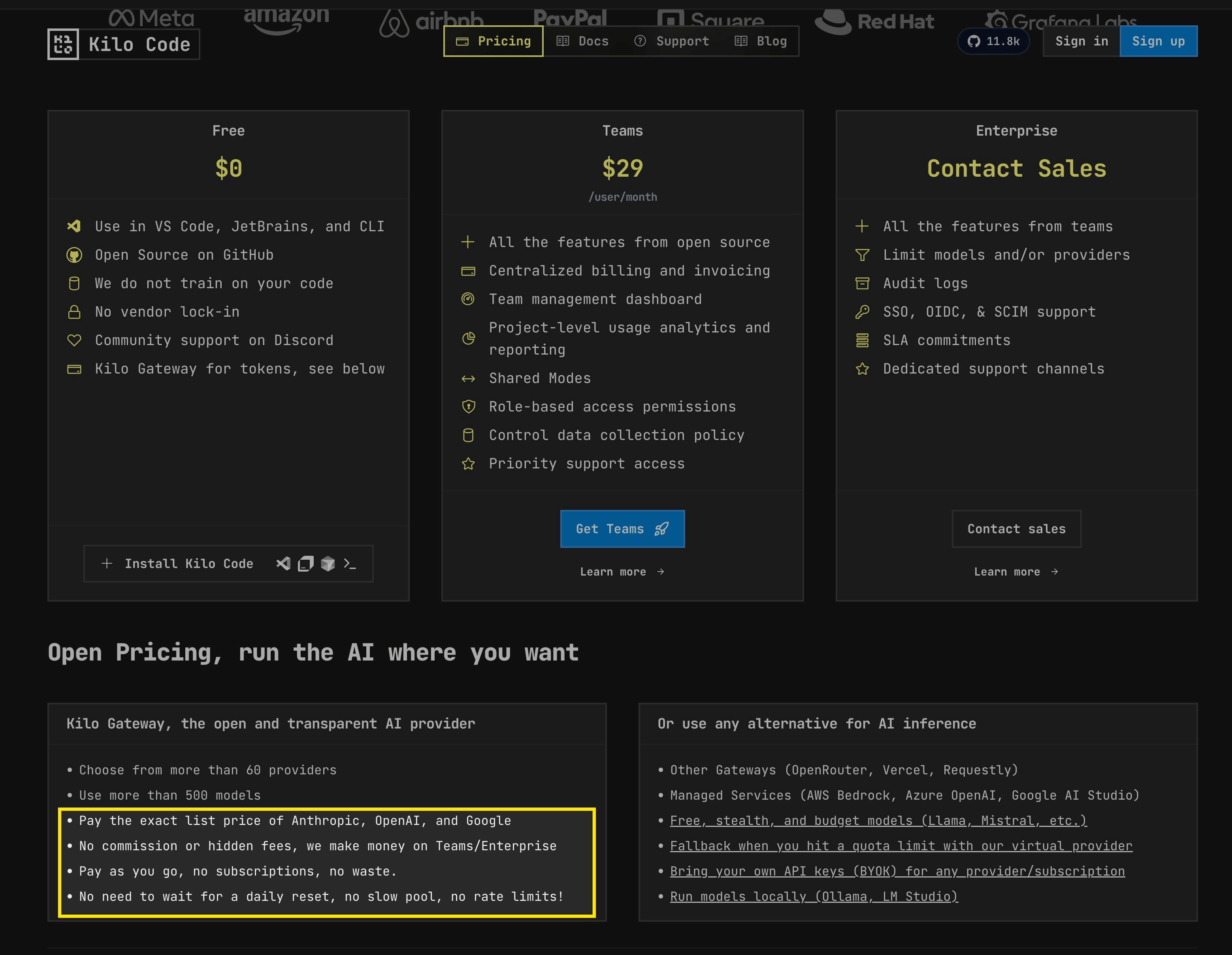 Second, some companies differentiate by pricing model. Take AI coding startup Kilo Code: