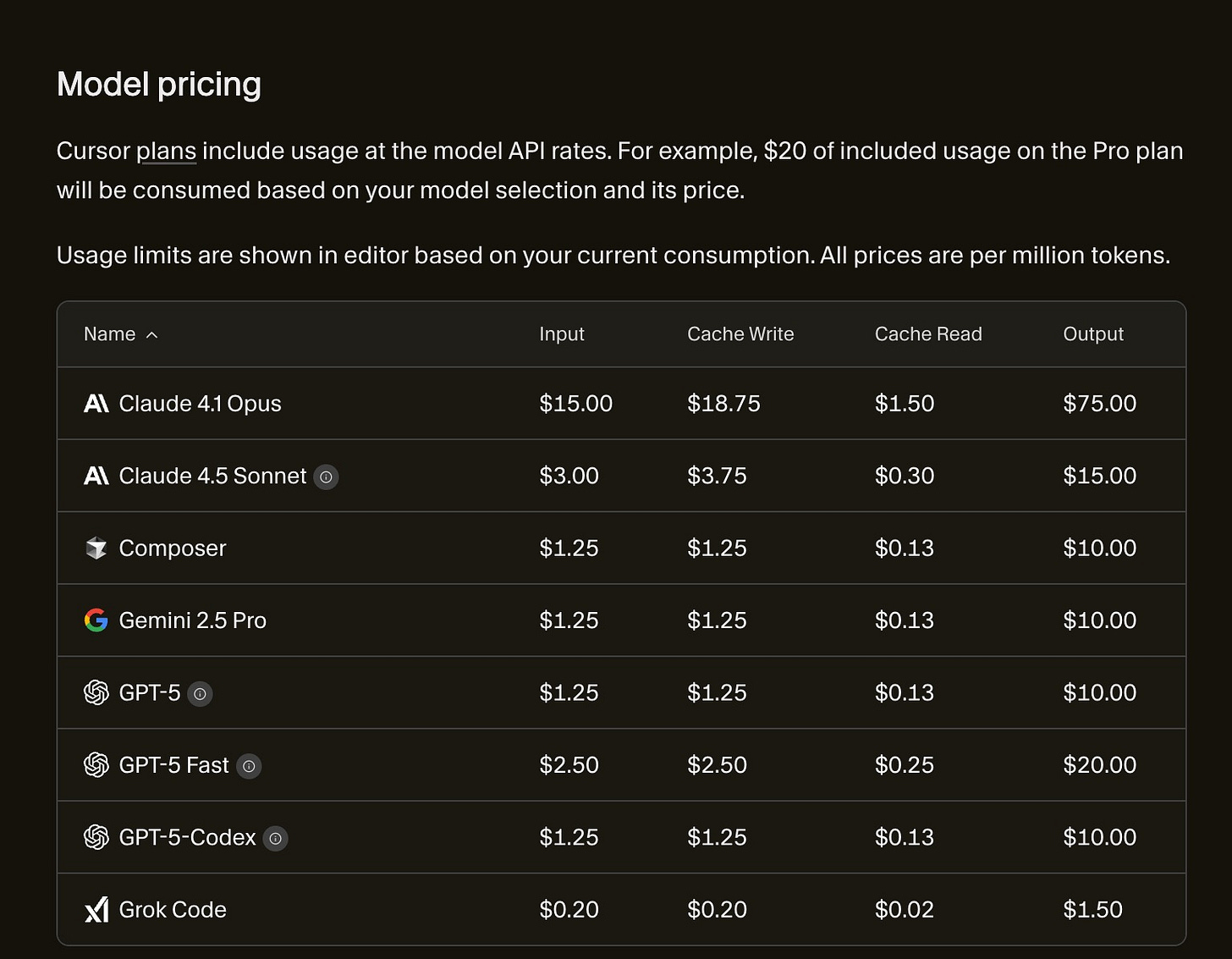 Subscriptions with overages include usage. Once that budget is used up, additional usage is billed on top of the subscription, usually measured in consumption. For example, each Cursor subscription includes a dollar-denominated usage budget. Use it up and you pay for pure usage based on this table: